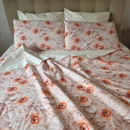 În mijlocul iernii, când natura adoarme sub mantia albă a zăpezii, acest imprimeu aduce în dormitor parfumul și frumusețea trandafirilor nemuritori. Realizat prin imprimare digitală 5D, designul surprinde delicatețea petalelor și eleganța florilor, într-o paletă caldă de nuanțe bej și piersică, ce transformă lenjeria de pat într-o adevărată operă de artă.