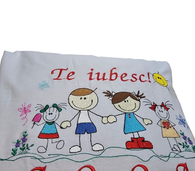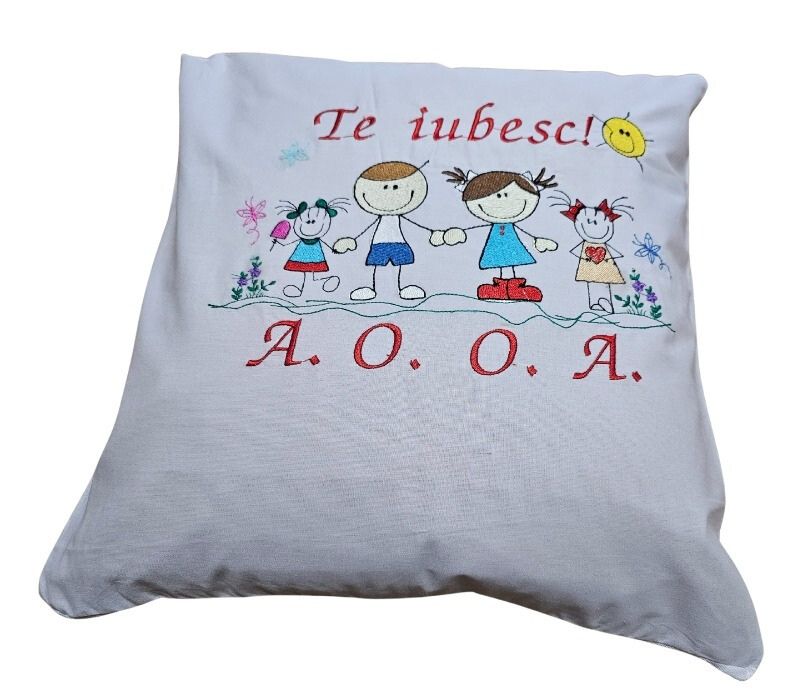 Designul broderiei reprezintă o familie fericită formată din mamă, tată și două fetițe. Această imagine adorabilă adaugă un caracter ludic și familial fetei de pernă. Deasupra familiei, cu o broderie atent realizată, se regăsește mesajul puternic și emoționant: „Te iubesc”. Acest detaliu subliniază afecțiunea și legătura profundă dintre membrii familiei, făcând fata de pernă nu doar o piesă decorativă, ci și o declarație de dragoste.