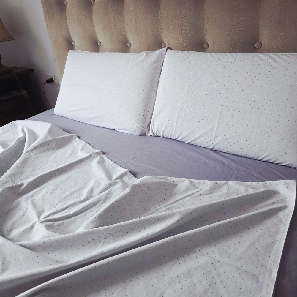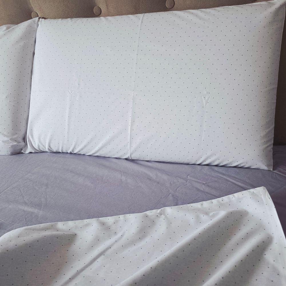 Lenjerie de pat din bumbac ranforce 100%, imprimată digital, cu design modern gri și buline discrete. Moale, respirabilă și rezistentă, realizată cu grijă în atelierul Ariale pentru un somn confortabil și elegant.