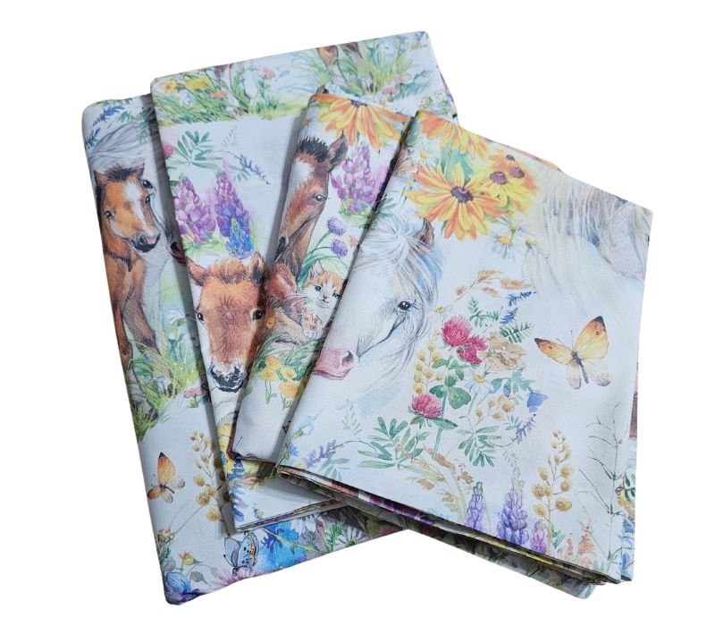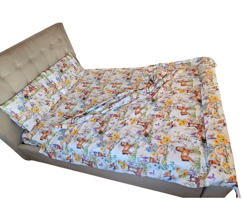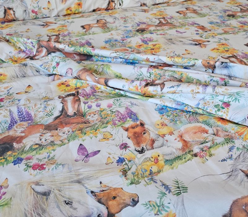 Fiecare detaliu al designului este invăluit intr-o aură de farmec și imbrățișează o tematică inspirată de natură: un cal superb alb, in armonie cu puiul său, flori multicolore, puisori jucauși, pisici gingașe și fluturi dansand in jur. Aceste elemente se contopesc armonios pe fundalul materialului de bumbac imprimat cu laser, evidențiind fiecare nuanță și contur intr-un mod unic și captivant.