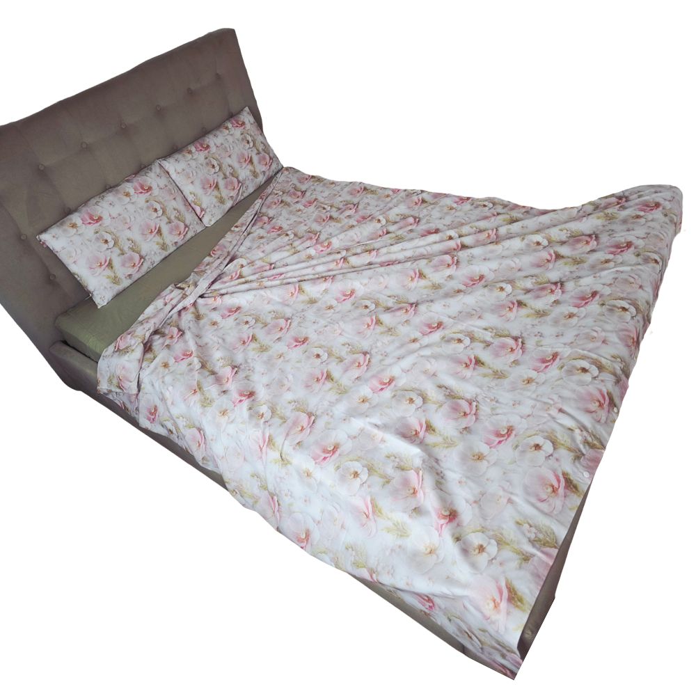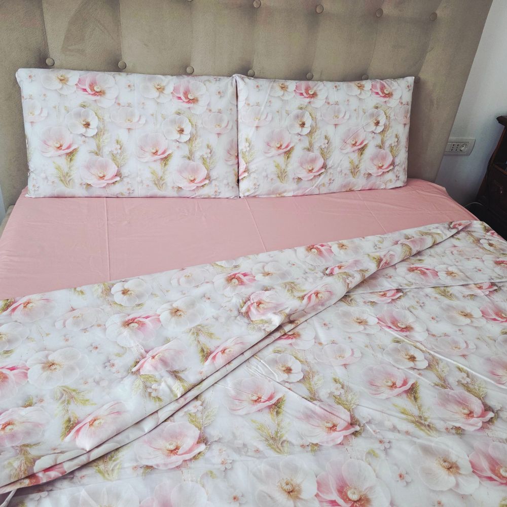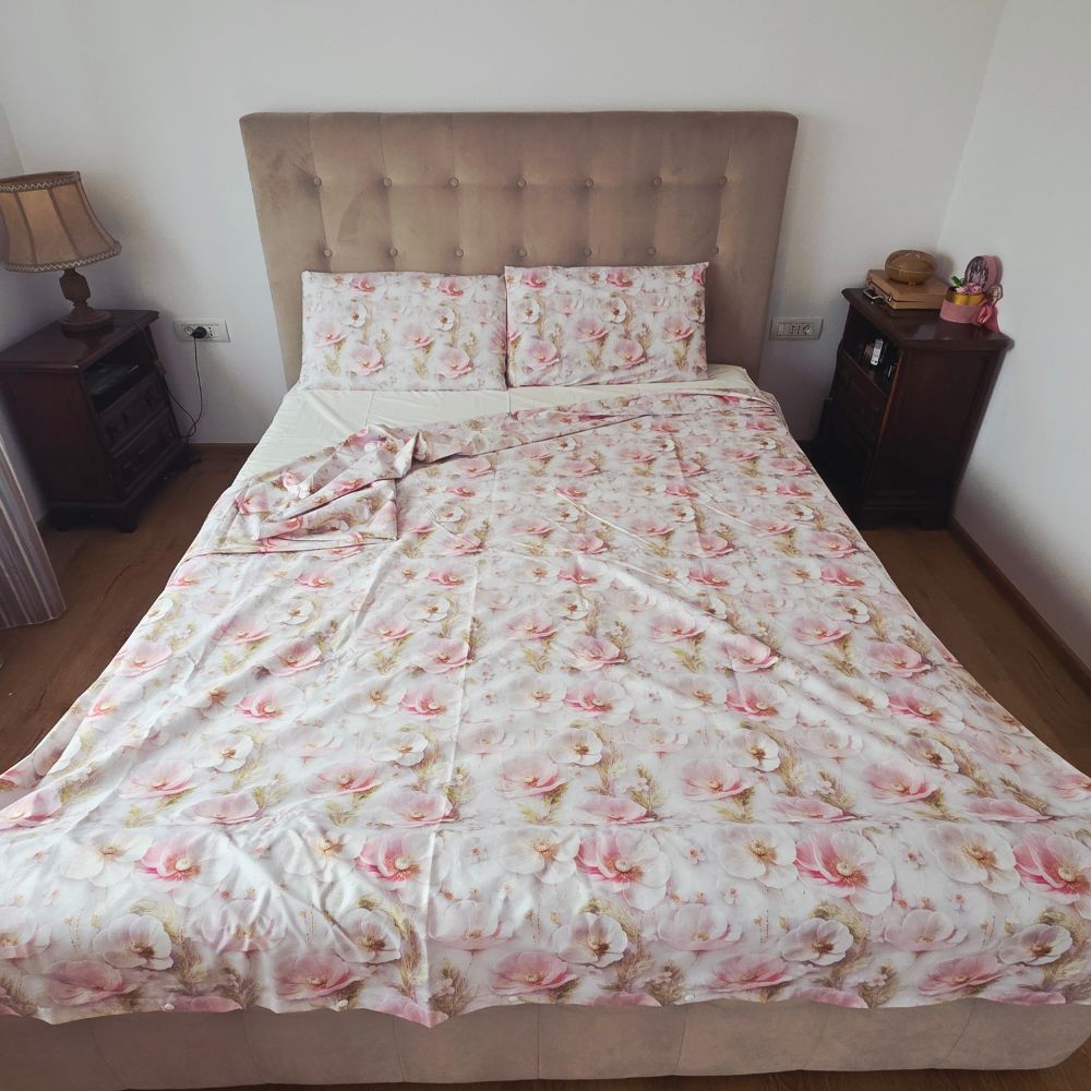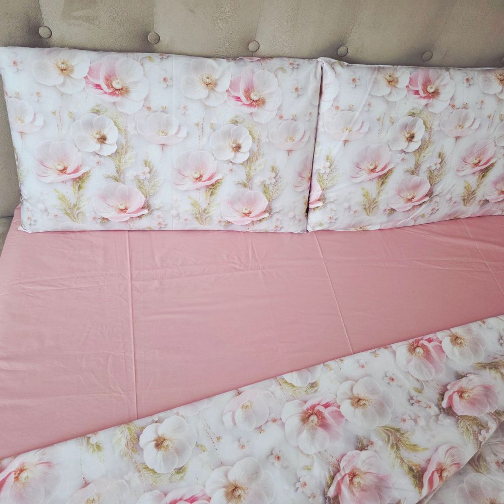 Lenjerie de Pat „Flori pudrate” – Bumbac 100%, Imprimare Digitală, 4 Piese