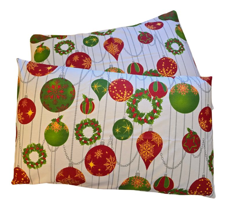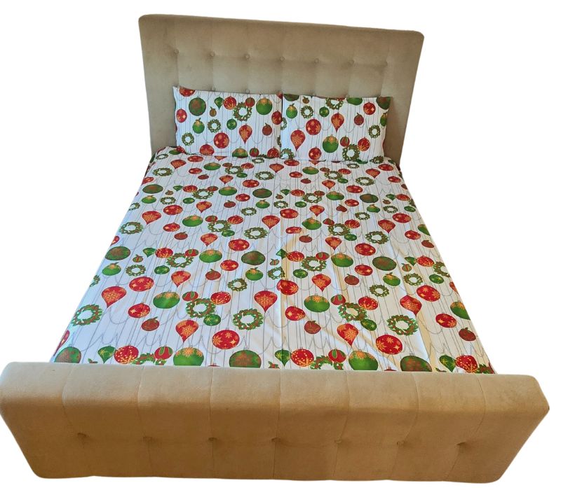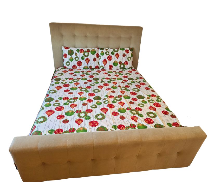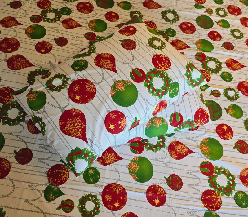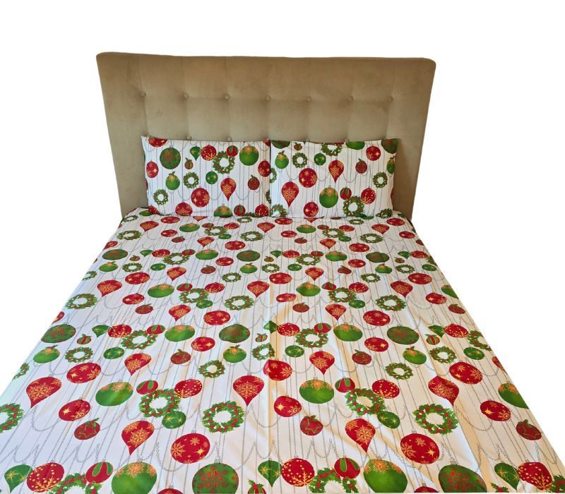 ✨ Imprimeul digital “Magic Christmas” este o explozie de culoare: globuri roșii și verzi decorate cu fulgi aurii, coronițe de brad și lanțuri argintii delicate. Culorile intense, vibrante și perfect echilibrate transformă orice dormitor într-un colț de poveste de iarnă.
