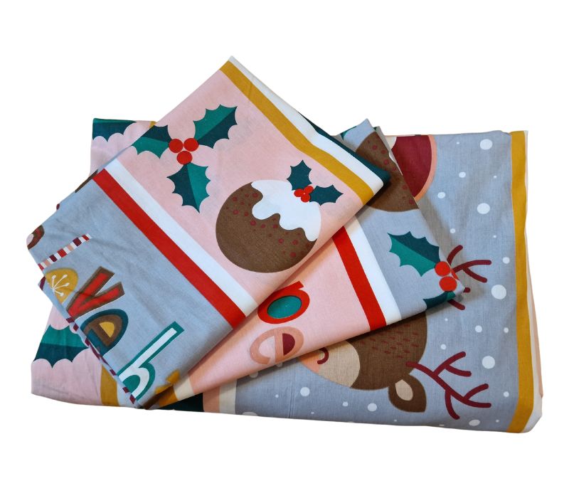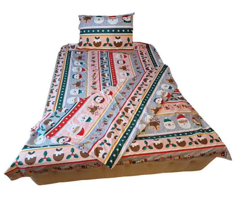Lenjeria de pat pentru o persoana, 3 piese, Crăciun Happy by ARIALE, confecționată din bumbac ranforce, se distinge prin eleganța și calitatea sa excepțională. Cu un design de Crăciun multicolor, această lenjerie adaugă o notă festivă dormitorului, fiind, de asemenea, o opțiune perfectă pentru a fi oferită drept cadou.