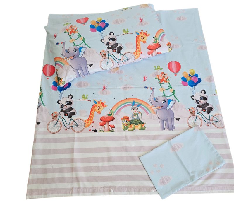 Designul fermecător, cu animale prietenoase și colorate, va transforma orice dormitor într-o lume de poveste. Panda pe bicicletă, elefantul fericit și girafa jucăușă, toate se reunesc pentru a crea un univers de basm în care copiii se vor simți în siguranță și fericiți.